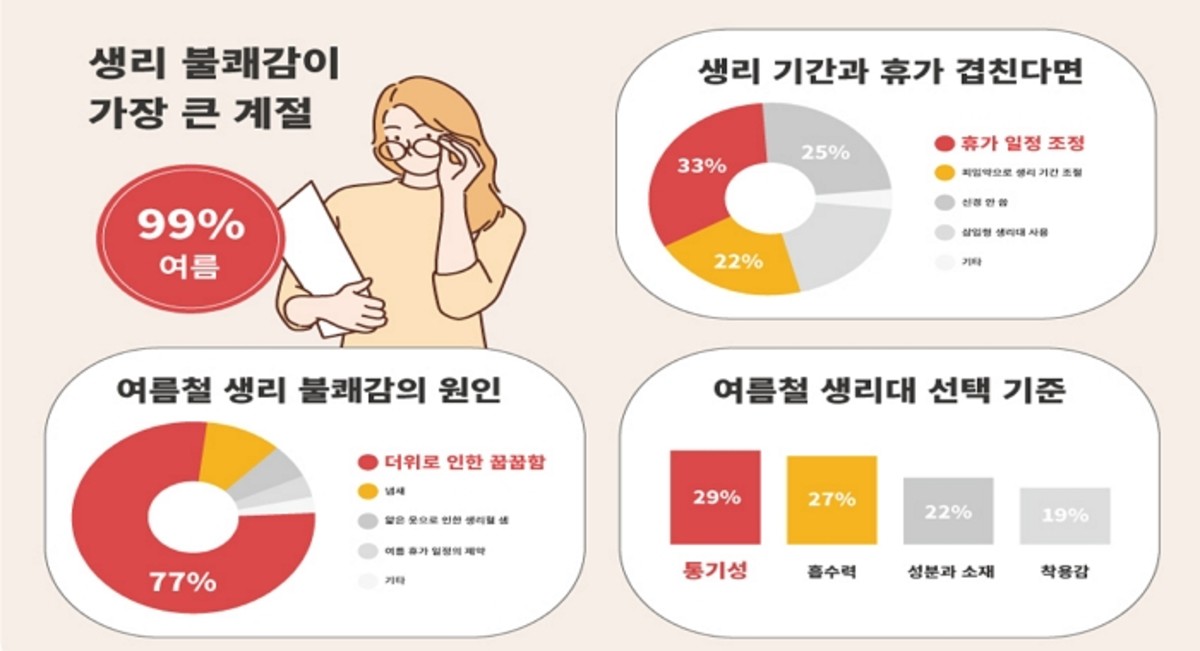 실제 이번 조사에서 생리로 인한 불쾌감을 가장 강하게 느끼는 계절을 묻는 질문에 응답자의 대부분을 차지하는 99%가 '여름'을 지목했다.