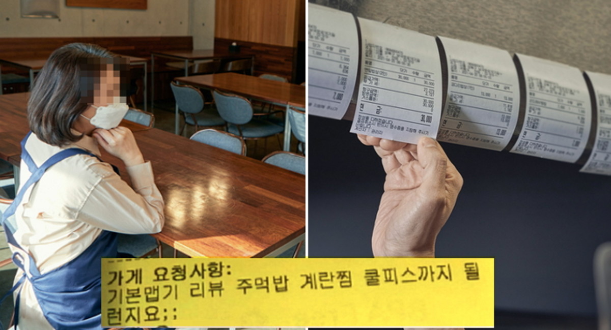 배달 앱으로 주문한 듯한 고객 영수증 상단의 '가게 요청사항'란에는 "기본 맵기. 리뷰 주먹밥, 계란찜, 쿨피스까지 될는지요"라는 요청이 적혀 있다.