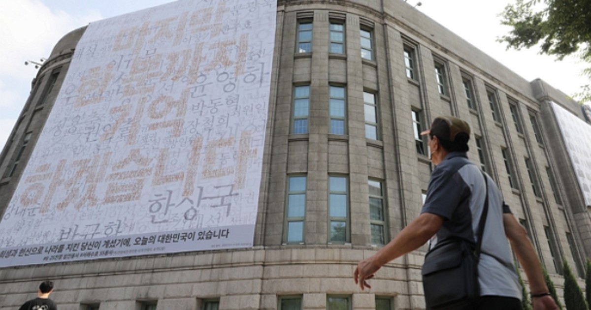 24일 서울시는 6.25전쟁 일을 하루 앞두고 청사 앞 서울도서관 서편 외벽에 대형 현수막을 내걸었다. 해당 현수막은 광화문 방향 세종대로에서 한눈에 들어오는 큰 크기로 제작됐다.