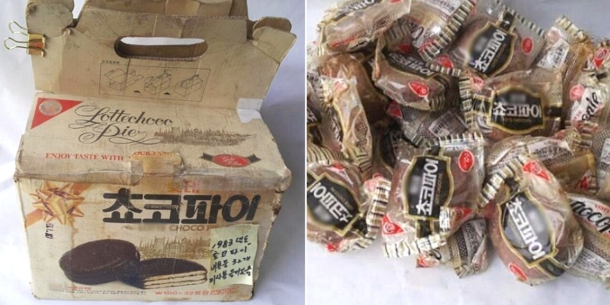 박스에는 "1983년도 '초코파이' 내용물 32개. 미사용 들어있음"이라고 쓴 쪽지가 붙어져 있어 이 초코파이가 1983년에 제조됐다는 걸 알 수 있었다.
