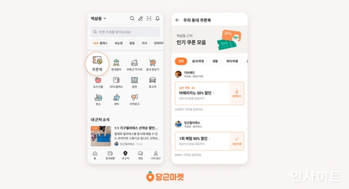 [인사이트] 김소영 기자 = 당근마켓이 '내 근처' 탭에 동네 상점 쿠폰을 모아 보여주는 '쿠폰북' 서비스를 새로 열었다고 밝혔다.