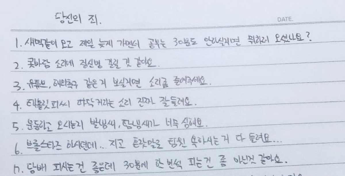 쪽지를 건넨 사람은 '당신의 죄'라는 글과 함께 몇 가지 내용을 정리해 지적했다. 쪽지 내용을 살펴보면 해당 글을 쓴 사람은 상당한 괴로움에 시달린 것으로 보인다.