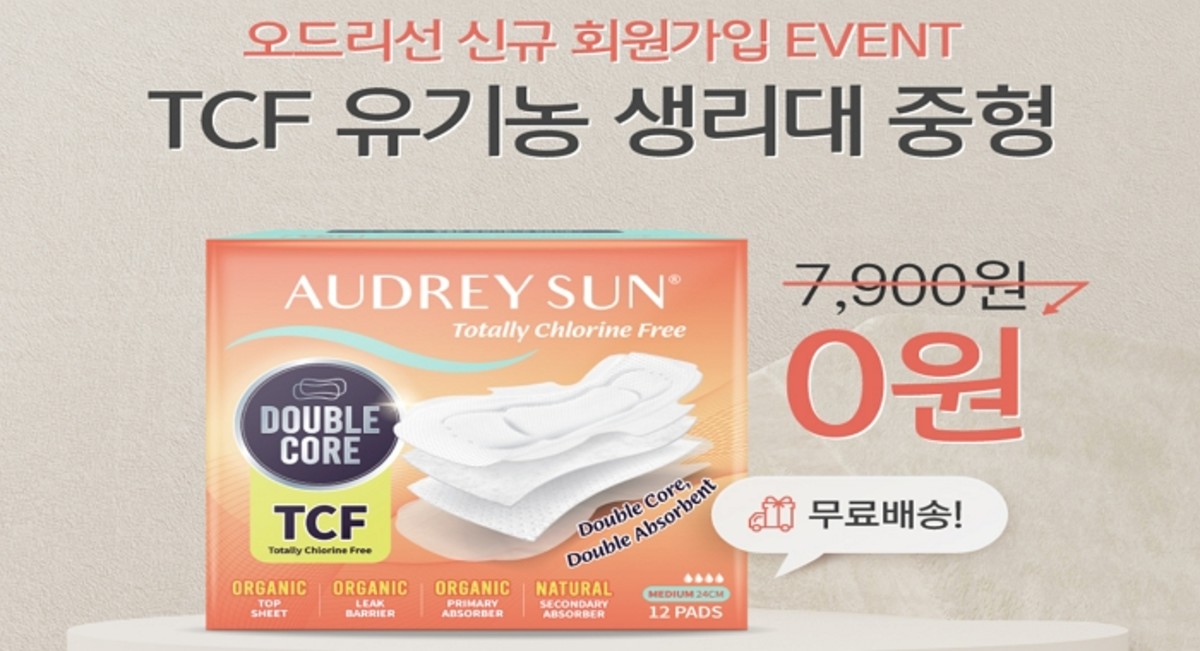 [인사이트] 김다솜 기자 = 오드리선이 자사몰 리뉴얼을 기념해, 선착순으로 신규 가입 고객 총 512명에게 간판 제품인 '오드리선 TCF 더블코어 생리대'를 무료 제공한다고 밝혔다..