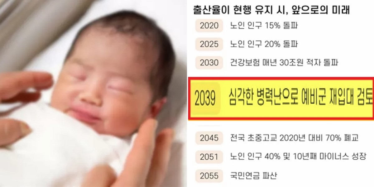 출산율이 현행을 유지한다면 인구 감소를 넘어 '인구 소멸·멸절'까지도 이어질 수 있는 상황이다. 만약 흐름이 유지된다면 2030년대에는 예비역이 재입대하는 상황이 일어날 수 있다는 분석이 나왔다.