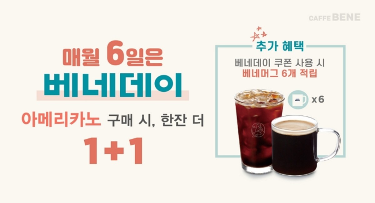 여기에 1+1 쿠폰 사용 시 베네머그를 6개나 적립해주는 이벤트도 오는 8월까지 한정으로 진행된다. 베네머그는 제조 메뉴 주문 시 메뉴별 1개씩 적립되며, 15개를 적립할 때마다 무료 음료 쿠폰이 제공된다.