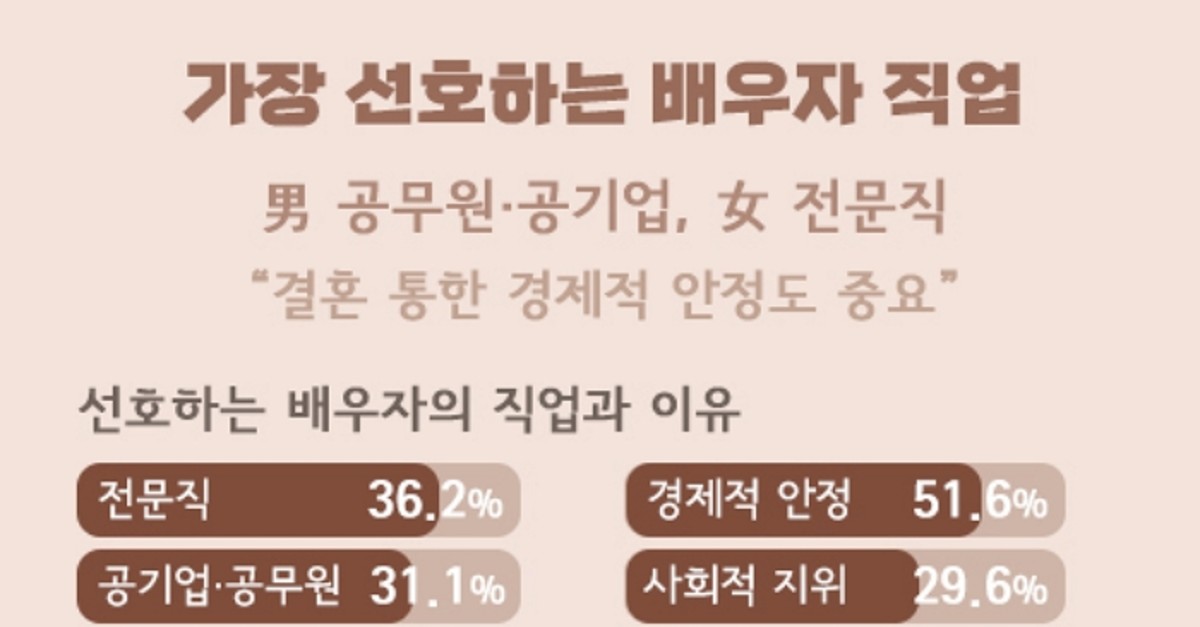 선택한 이유에는 '경제적 안정(51.6%)', '사회적 지위(29.6%)', '같은 직종이라(11.9%)', '여유 시간이 중요해서(6.9%)' 등을 꼽았다.
