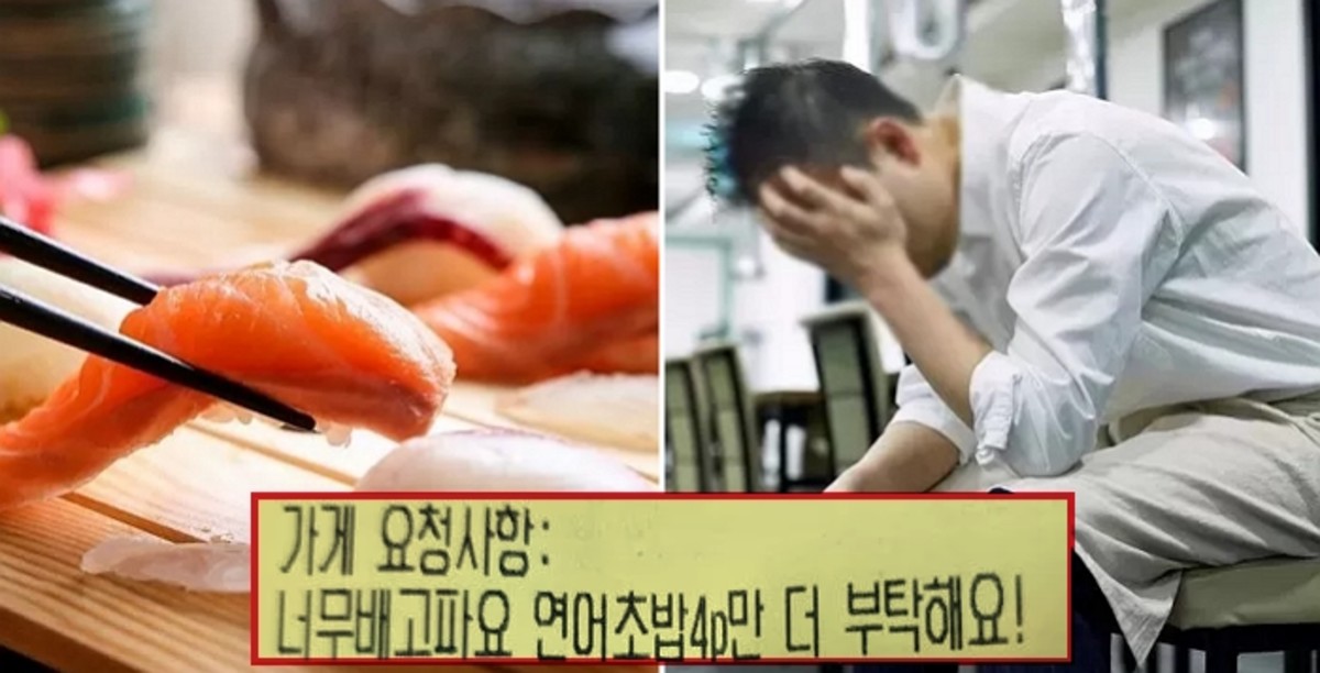 사진 속 가게 요청사항에는 "너무 배고파요. 연어초밥 4개만 더 부탁해요"라며 "리뷰 예쁘게 잘 올리겠습니다. 약속해요 별 다섯 리뷰"라고 적혀있다.