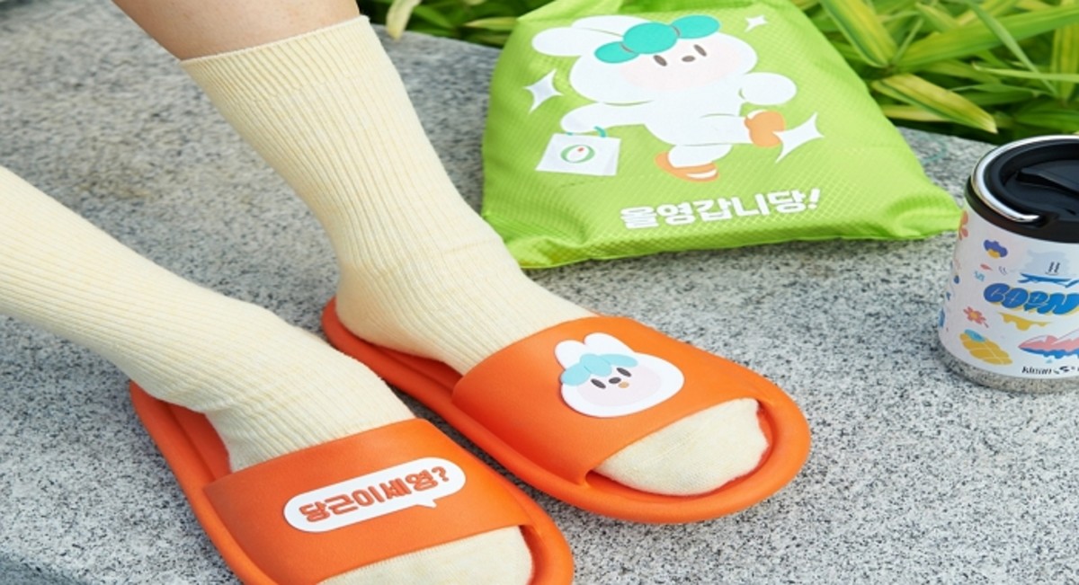 동네 산책 가방에는 '올영갑니당' 문구와 함께 동네 산책 굿즈를 착용하고 올리브영으로 향하는 당근이의 모습을 담았다. 슬리퍼와 가방 모두 친환경 소재로 제작한 것이 특징이다.