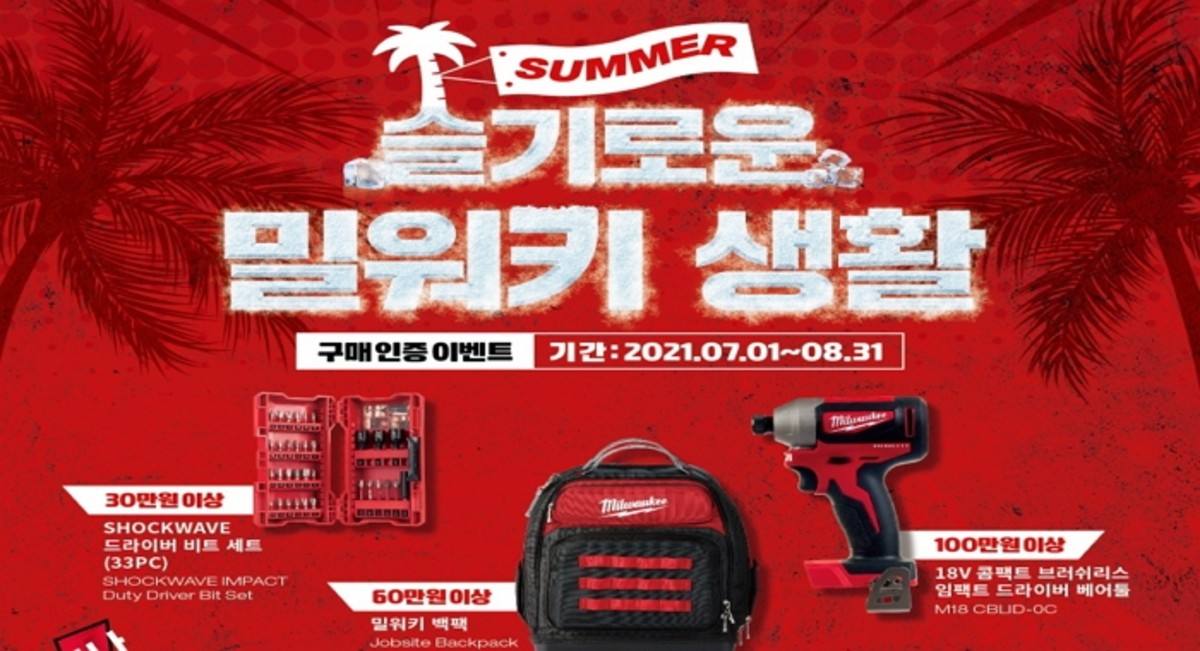 지난 1일부터 오는 8월 31일까지 두 달간 진행되는 이번 이벤트에서 밀워키는 구매 인증을 한 고객들 모두에게 금액별로 100% 사은품을 증정한다.
