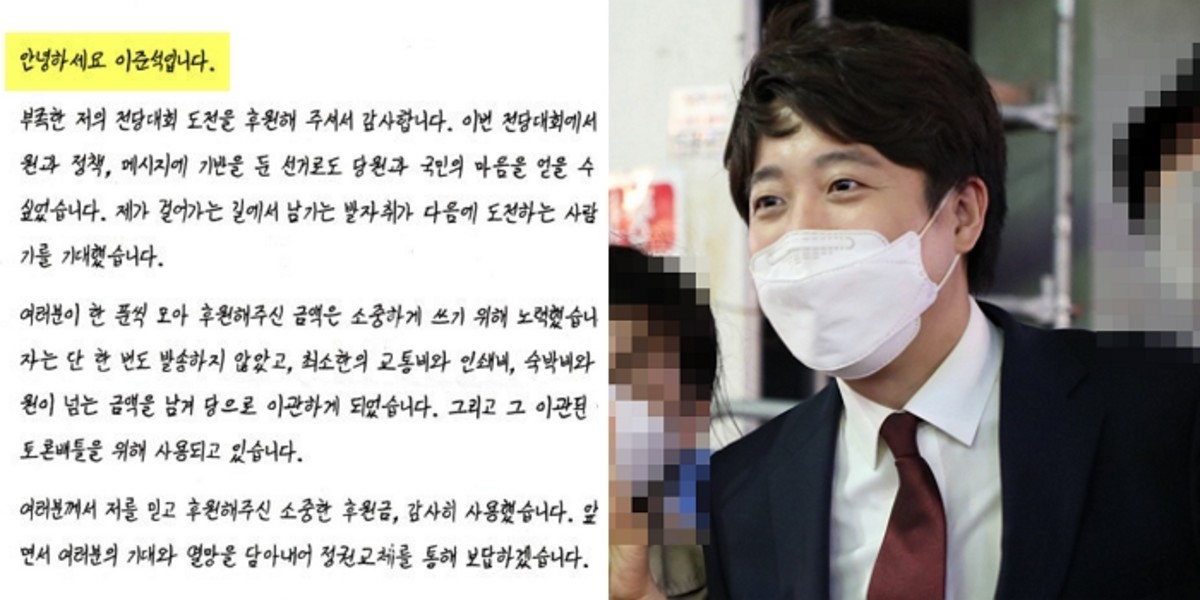 이준석 국민의힘 대표가 전당대회 도전을 후원해 준 지지자들에게 감사의 뜻을 담은 편지를 전달했다.