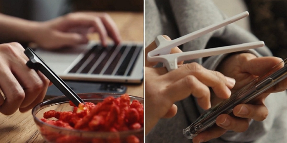 집게 모양의 게이밍 젓가락을 검지와 중지에 끼우기만 하면 직접 손을 쓰지 않고도 간편하게 과자를 집을 수 있다.