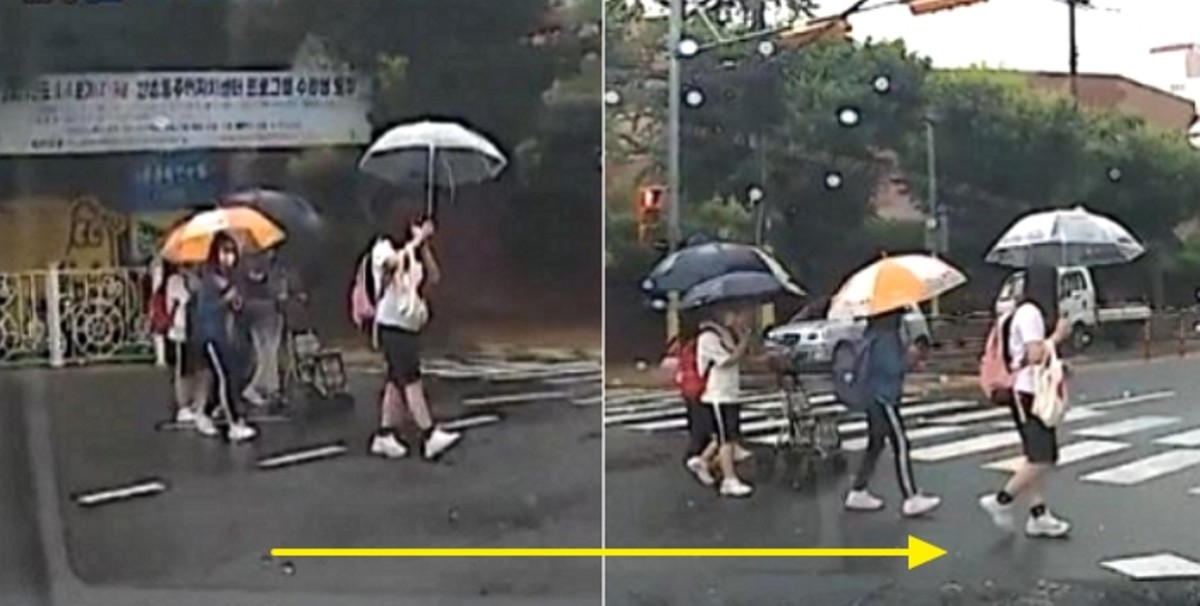영상 속에는 경상남도 창원시의 한 횡단보도에서 할머니와 초등학생들이 길을 건너는 모습이 담겼다.