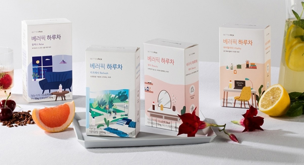 첫 제품으로 4종류의 스틱형 분말차가 패키지로 구성된 '베러픽 하루차'를 선보인다.