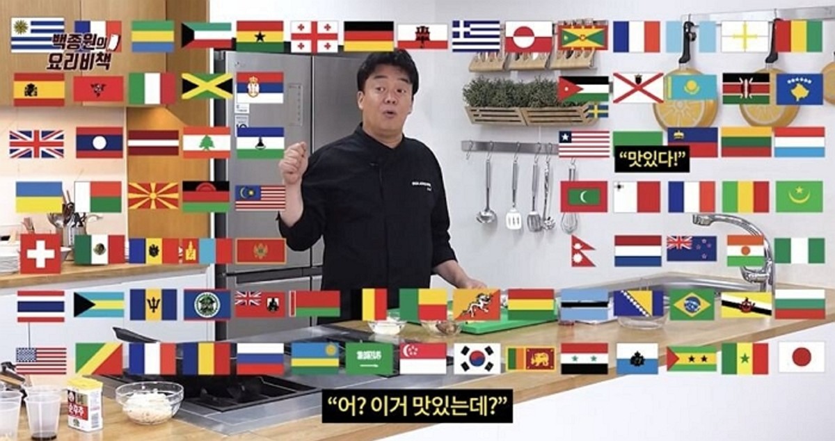 공개된 사진 속에는 백종원 대표가 운영 중인 유튜브 채널 '백종원의 요리비책'이라는 문구와 함께 전 세계 나라들의 국기가 촘촘하게 띄워져 있다.