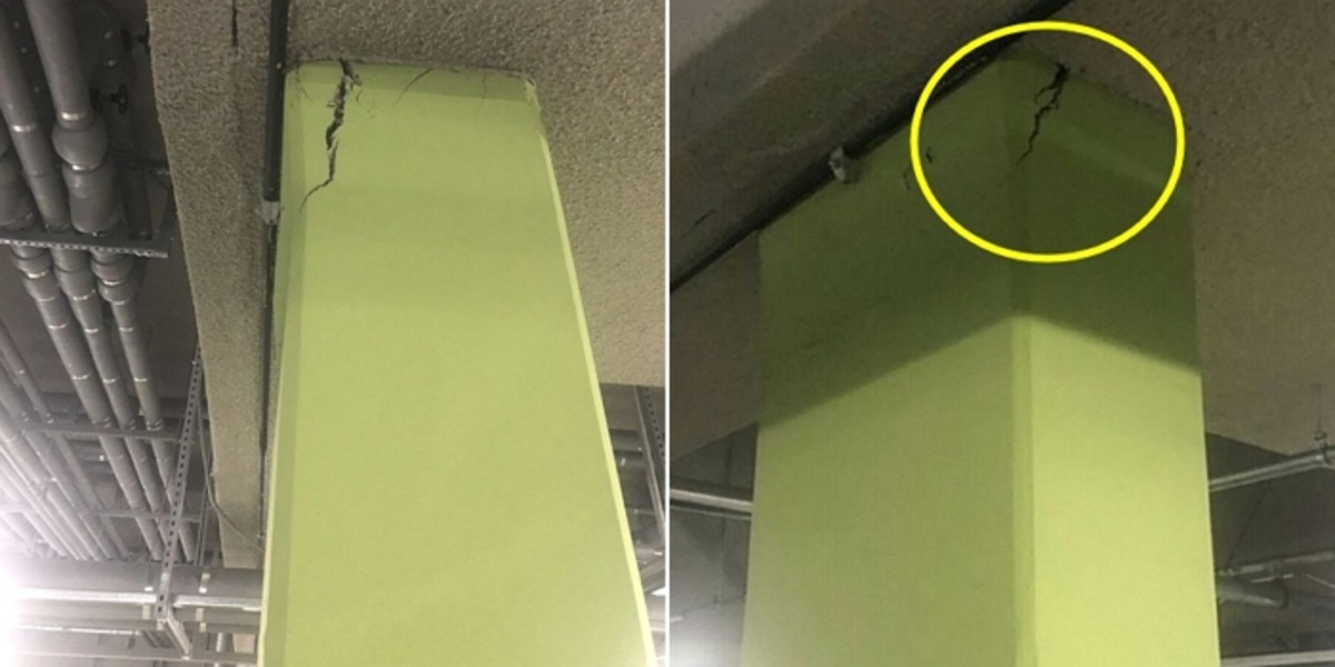 사진을 보자마자 지하주차장 천장 부분과 맞닿아 있는 기둥 상단에 세로로 길게 난 틈이 단번에 눈에 띈다.