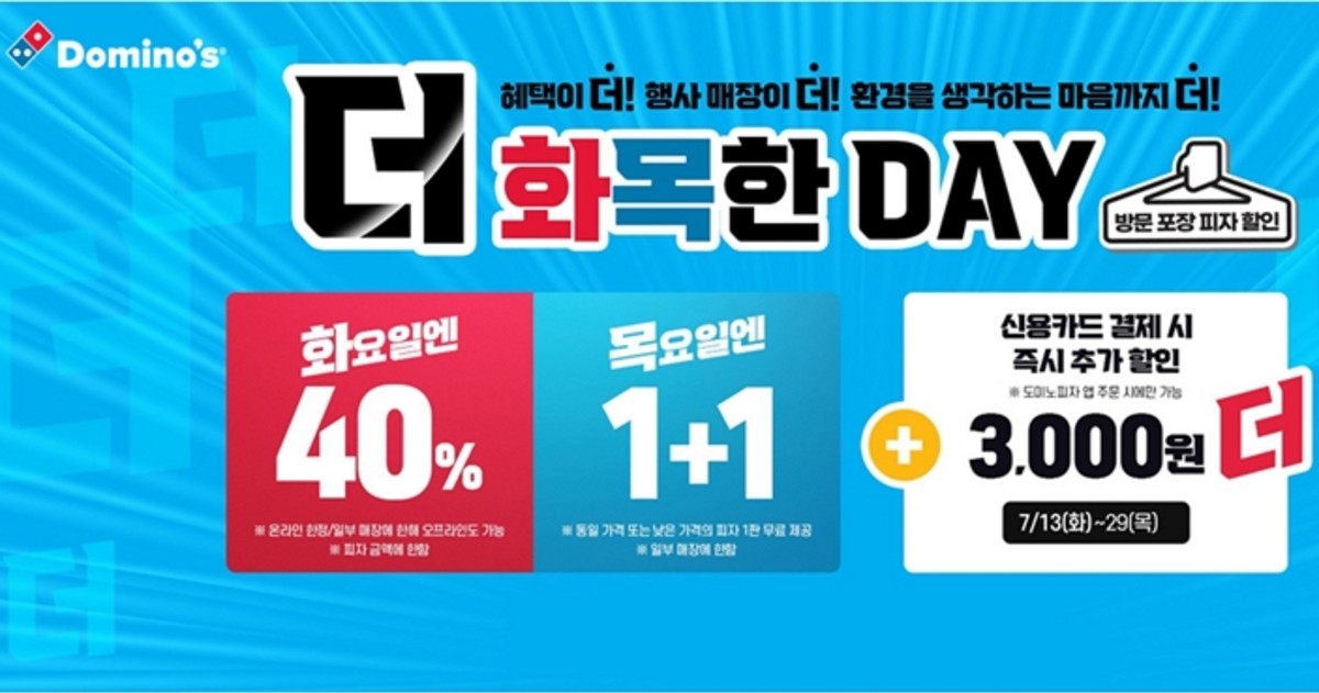 도미노피자 앱에서 더 화목한 데이 프로모션 적용 후 신용 카드로 결제 시 3천원을 즉시 추가 할인한다. 단, 신용카드 최종 결제 금액이 1만원 이상 시에만 적용 가능하다. (자세한 사항은 도미노피자 홈페이지 참조)