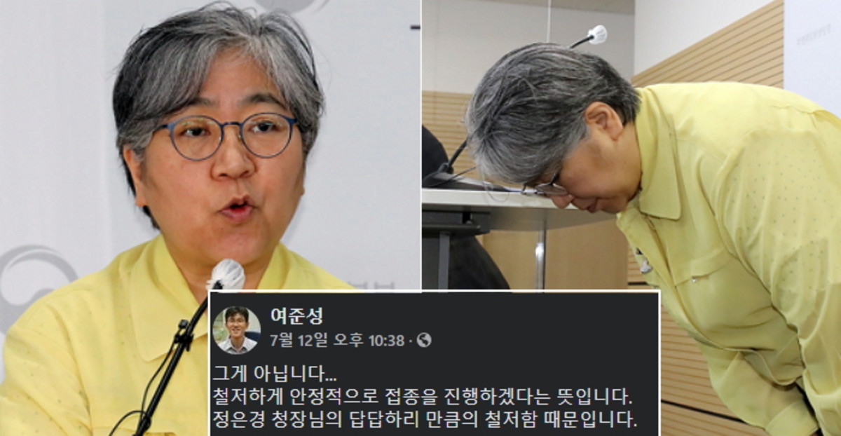 이와 함께 그는 "그게 아닙니다. 철저하게 안정적으로 접종을 진행하겠다는 뜻입니다. 정은경 청장님의 답답하리만큼의 철저함 때문입니다"라고 해명했다.