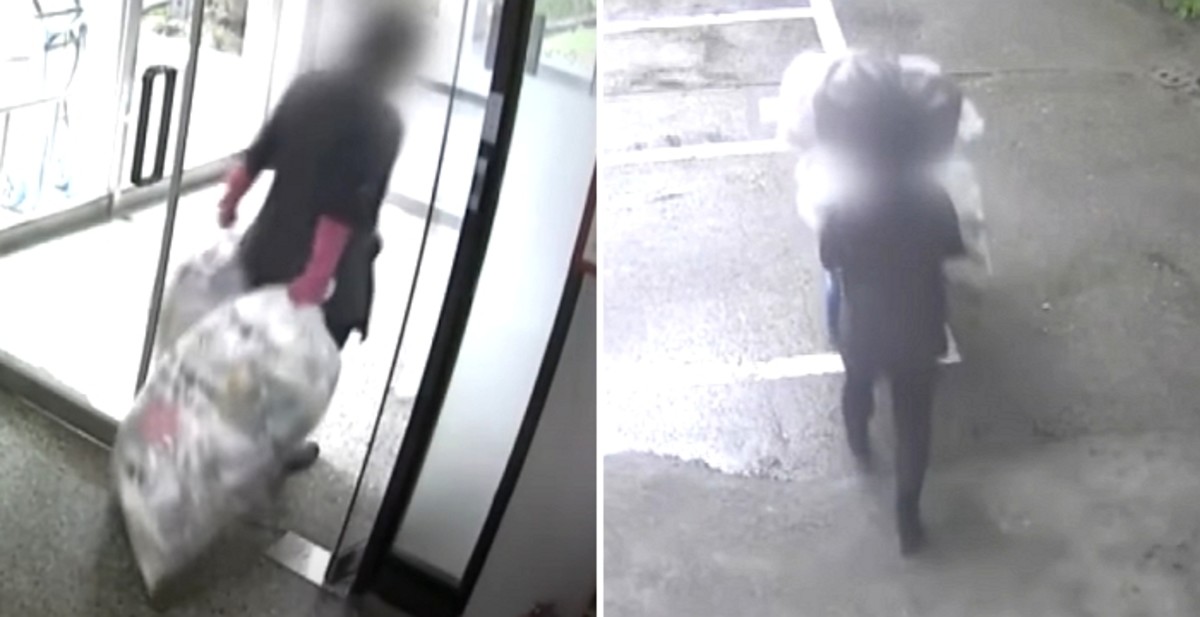 영상 속 여성은 곳곳에서 쓰레기를 모으고 무거워진 봉투를 겨우 끌고 다닌다.