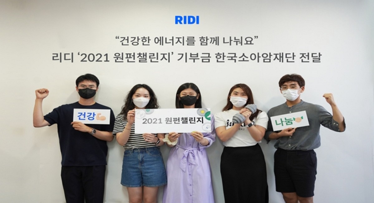 리디 주식회사는 임직원들의 체력관리 활동을 통해 기부금을 쌓아가는 사내이벤트 '2021 원펀챌린지' 캠페인을 통해 성금을 마련하였으며, 전달된 성금은 투병중인 환아들의 치료비 및 외래치료비, 정서지원사업비 등으로 사용될 예정이다.