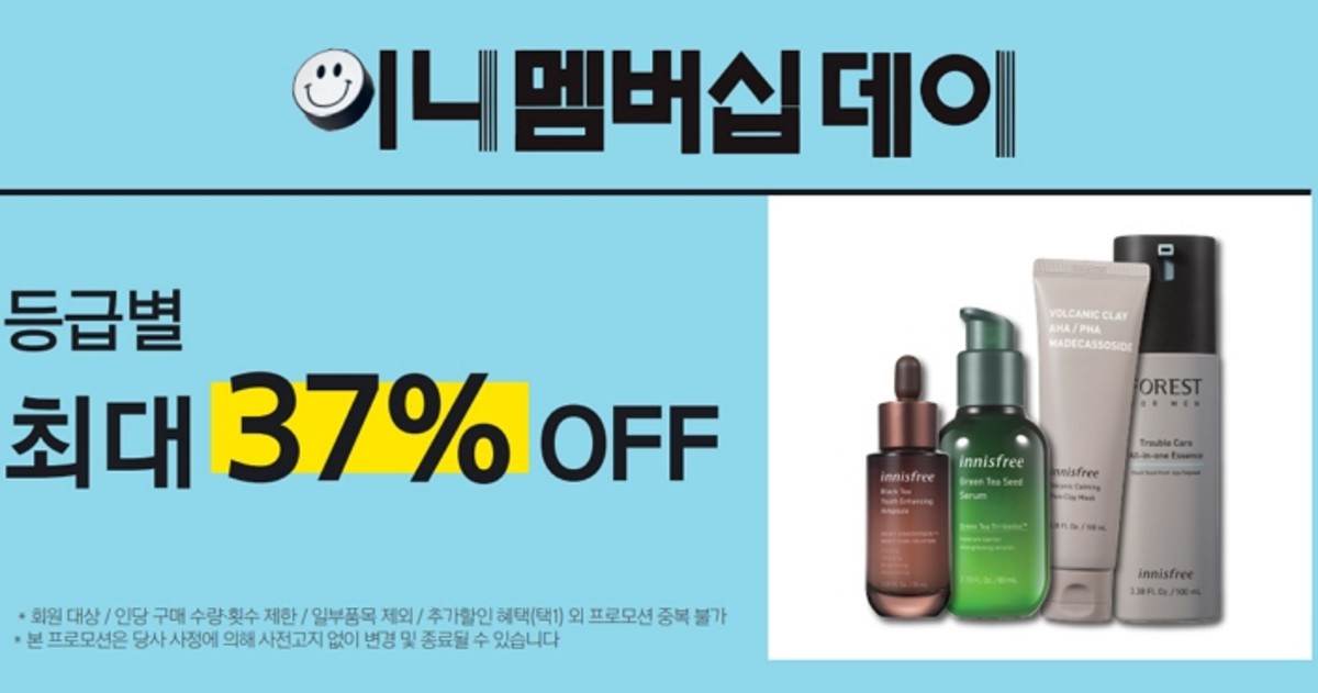 오늘(15일)부터 3일간 등급별 할인 혜택은 물론 등급에 상관없이 품목별 및 결제 수단별 할인을 누릴 수 있는 이니스프리 '7월 멤버십데이'의 자세한 내용은 이니스프리 매장 및 홈페이지를 통해 확인할 수 있다.