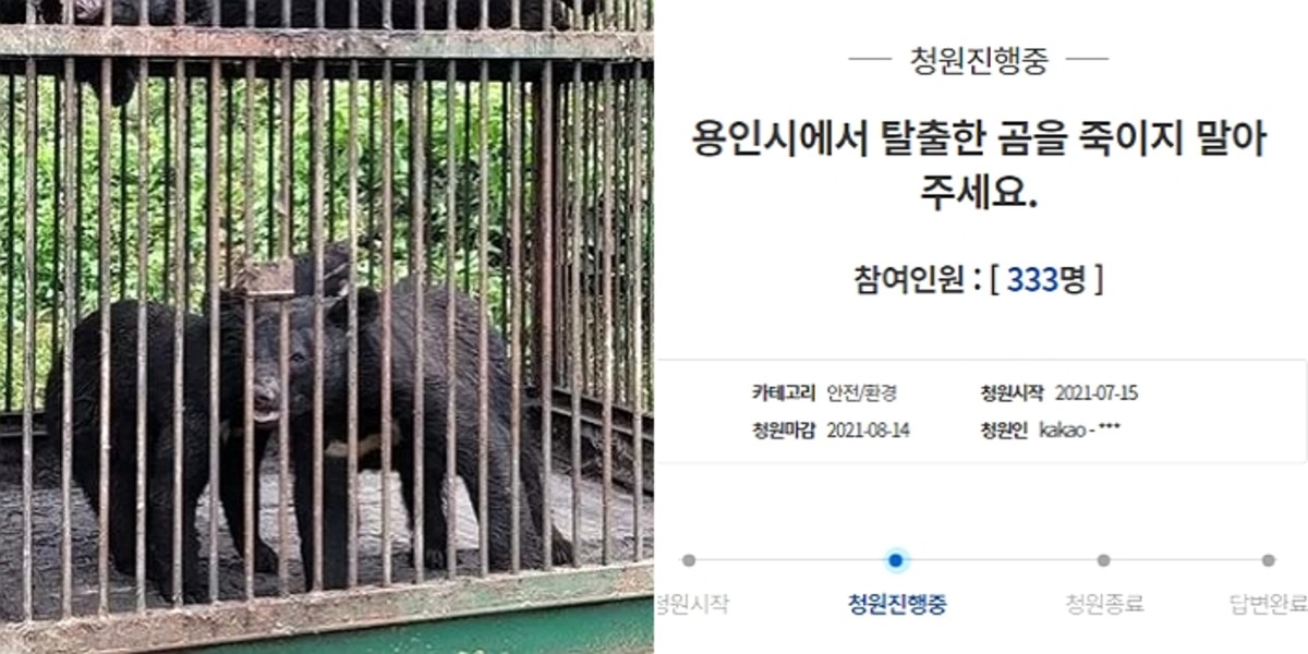 이런 가운데 지난 15일 청와대 국민청원 게시판에는 '용인시에서 탈출한 곰을 죽이지 말아주세요'라는 제목의 청원 글이 올라왔다.
