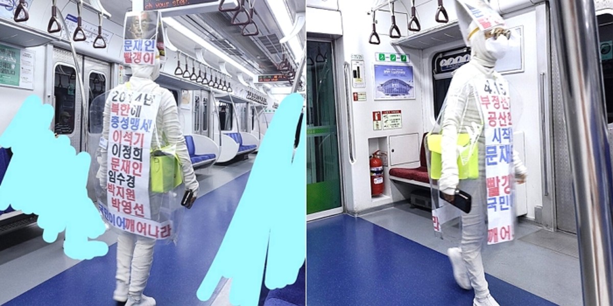 게시물에는 지하철 1호선 열차 칸에 등장한 한 빌런 사진 두 장이 첨부됐다.
