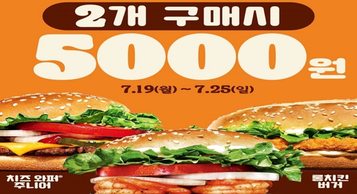 프로모션 대상 메뉴는 '통새우와퍼주니어', '치즈와퍼주니어', '롱치킨버거'로, 종류에 상관없이 2개 구매시 할인 혜택을 누릴 수 있다.
