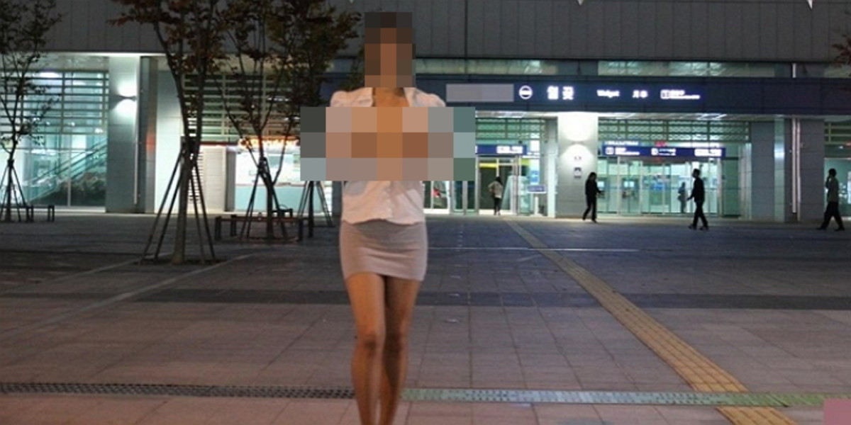 사진 속 여성은 수인분당선 월곶역 바로 앞에서 상의를 열어젖혀 가슴 절반 정도를 드러내고 있다.