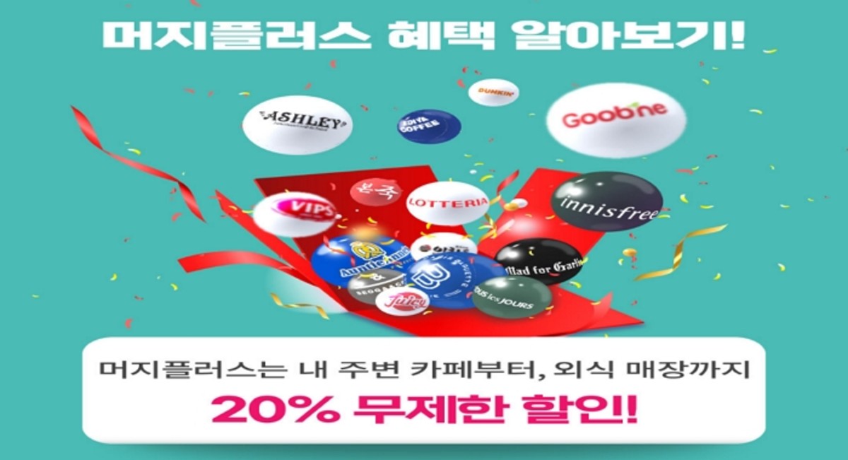 '머지플러스'란'머지포인트'앱에서 매월 1만 5천원의 구독료를 내고 구독하면 카페, 외식, 편의점 등 200여개 브랜드, 전국 8만 여개 가맹점에서 상시 20% 할인 혜택을 받을 수 있는 서비스 이다.