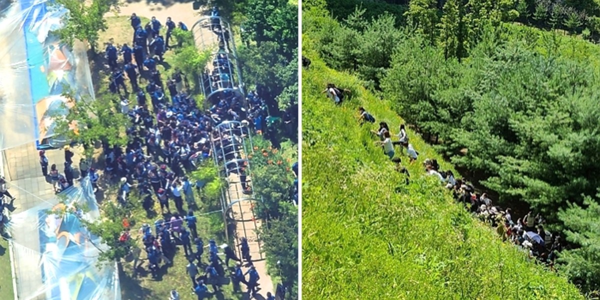 실제로 온라인 커뮤니티 '블라인드'에는 민주노총 공공운수노조 조합원으로 추정되는 이들이 수풀이 우거진 언덕을 단체로 올라가는 모습이 담겼다.