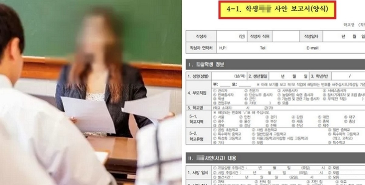 최근 각종 온라인 커뮤니티에는 '학생이 극단적 선택하면 교사가 작성하는 서류'라는 제목의 글이 올라왔다. 해당 게시글에는 교육부에서 관리하는 '학생자살 사망사안 보고서' 양식이 첨부돼 있다.