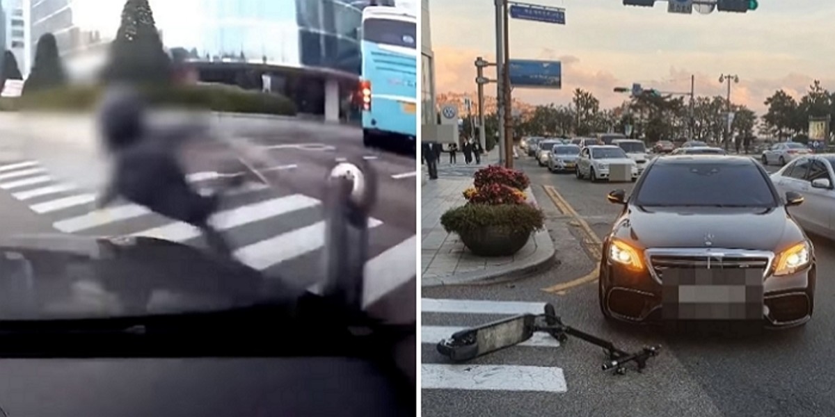벤츠는 빠른 속도로 달려온 킥보드를 미처 피하지 못하고 그대로 들이받았고, 킥보드 운전자는 길 저편으로 튕겨나가고 말았다.