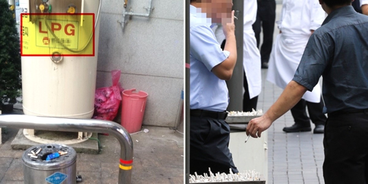사진을 촬영한 장소는 재떨이가 마련된 흡연 구역이다. 인근에는 상업용으로 추정되는 대형 LPG 가스통이 설치됐다.