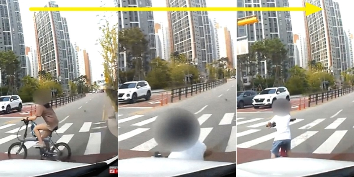 곧이어 자전거를 탄 어린이가 여성을 뒤따라 달려 나왔다. 앞서 지나간 여성의 아들이었다. 아이는 인도 턱에서 중심을 잡지 못하고 제보자의 자동차에 부딪혔다.