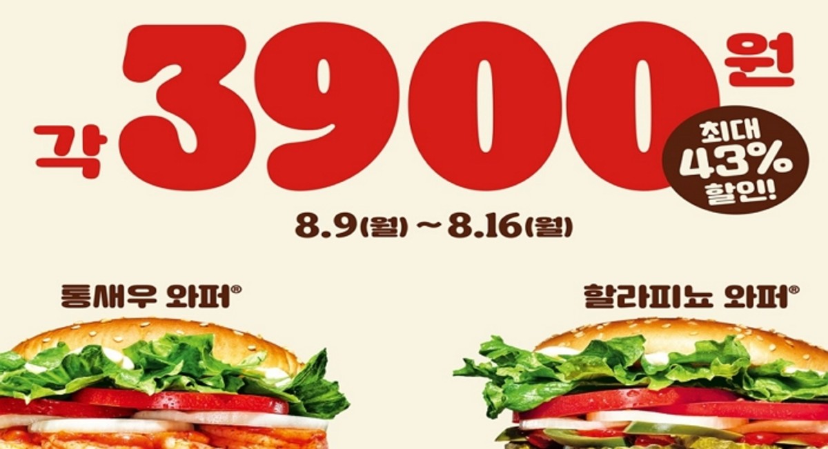 프로모션 대상 메뉴는 '통새우와퍼', '콰트로치즈와퍼', '할라피뇨와퍼'로, 모두 단품 3,900원이라는 합리적인 가격에 즐길 수 있다.