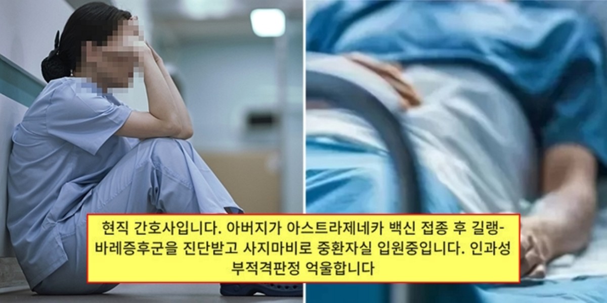 지난 9일 청와대 국민청원 게시판을 통해 간호사 A씨는 "아버지가 아스트라제네카 백신 접종 후 사지마비로 중환자실 입원 중"이라고 밝히며 "백신 인과성 부적격 판정이 억울하다"고 주장했다.