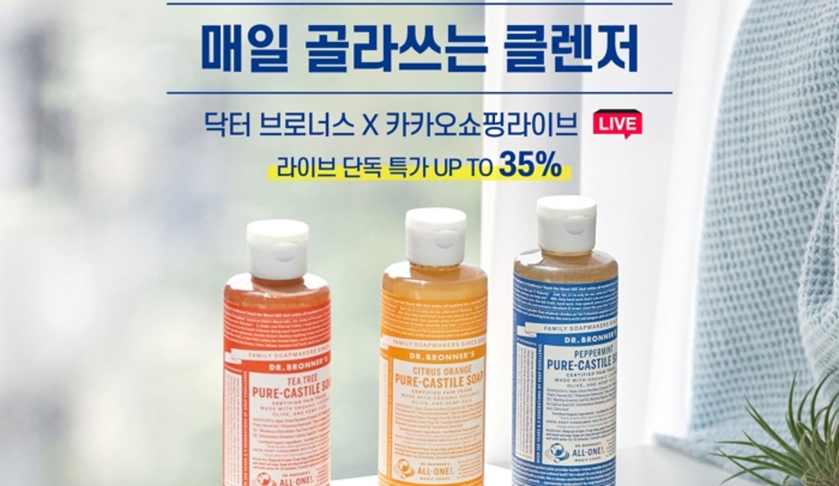 인기 유튜버 체스와 아우라M이 함께해 더욱 기대를 모으는 이번 카카오쇼핑라이브에서 닥터 브로너스는 미국 농무부(USDA) 인증 유기농 성분을 담은 리퀴드 타입 올인원 클렌저 '퓨어 캐스틸 솝'과 고체 비누 '퓨어 캐스틸 바솝'을 총 9가지의 다양한 옵션으로 선보인다. 모두 정가에서 30% 이상 할인된 합리적 가격에 구매 가능하다.