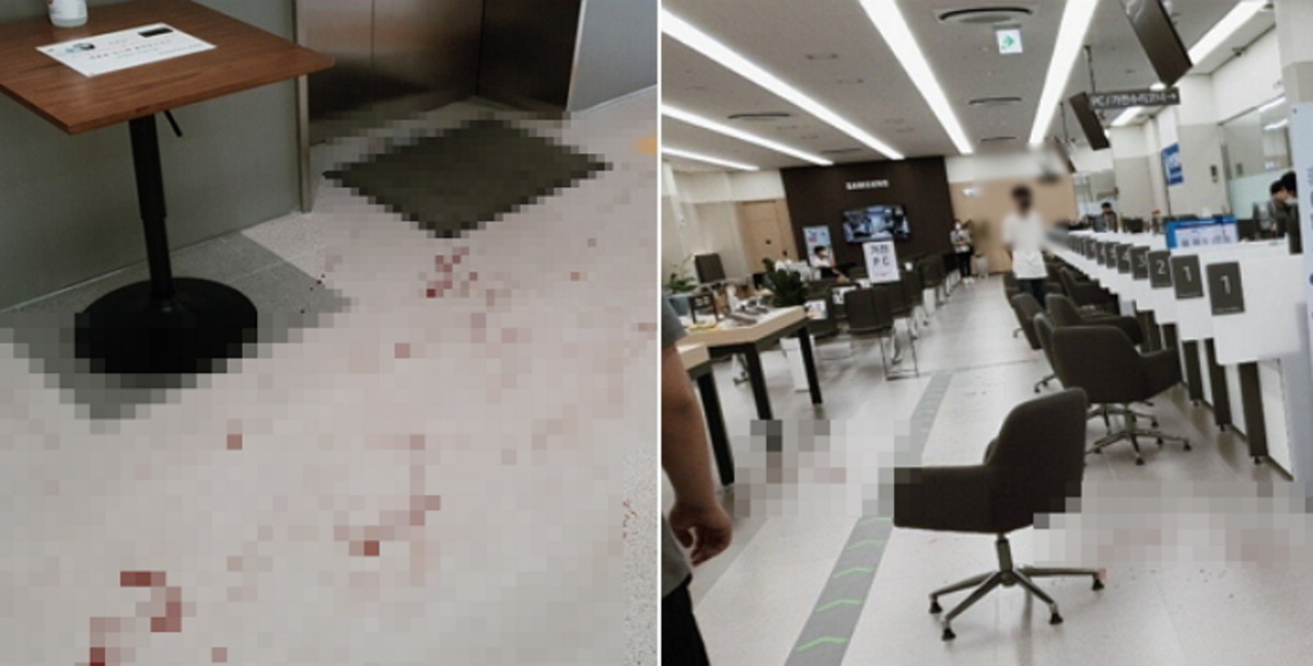 각종 온라인 커뮤니티에 공개된 현장 사진에는 승강기에서부터 고객 상담을 위한 좌석까지 혈흔이 튀어있는 모습이다.