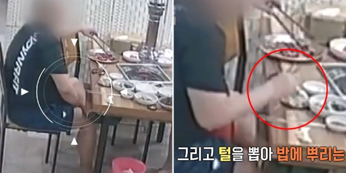 CCTV 영상에는 앞치마 속에 손을 넣었던 남성이 빠르게 고기에 무언가 뿌리는 모습이 담겼다. 심지어 다리를 만지는가 싶더니 털을 뽑아 밥에 뿌리는 모습도 그대로 포착됐다.