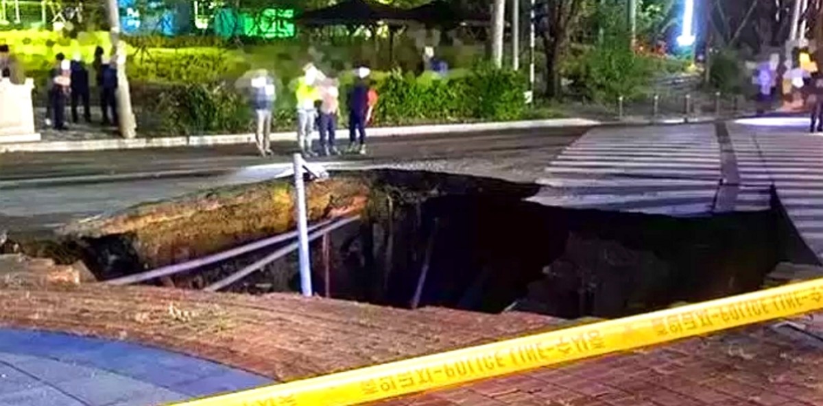 공개된 사진에는 인도와 횡단보도 일부가 무너져 내리고 인도에 세워져 있던 가로등이 구덩이에 파묻힌 모습이 보인다.