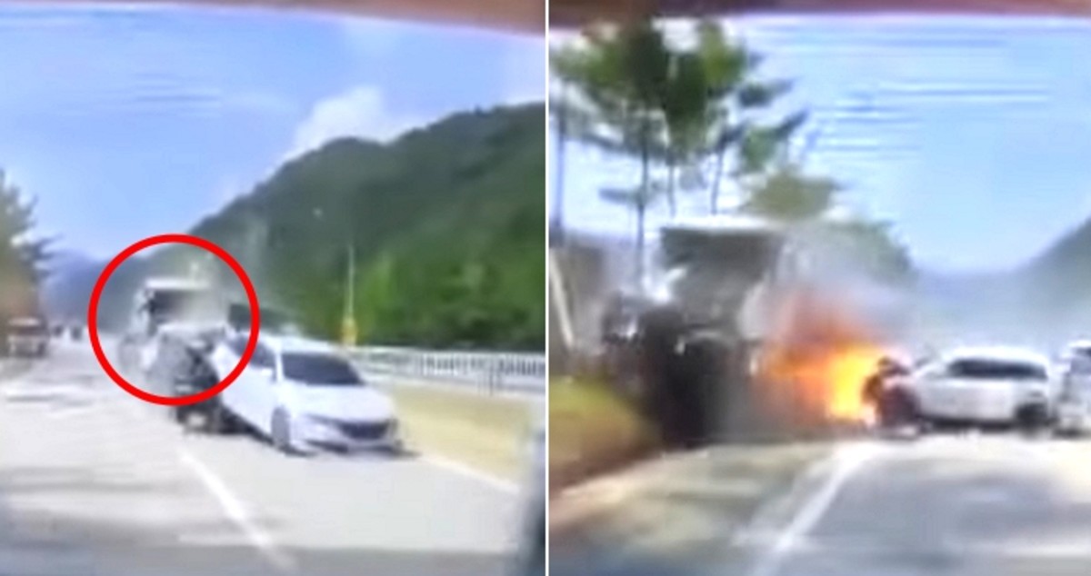 영상 속에서 25톤 탱크로리 트럭은 앞에서 서행 중이던 차량을 그대로 들이받았다.