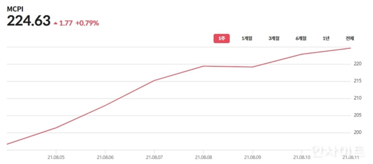 이는 지난해 7월 6일부터 19일까지 14일 동안 MCPI가 연속으로 올랐던 최장 상승 기간에 이어 두번째로 높은 수치다. MCPI는 9일 0.25포인트가 빠지며 살짝 주춤했으나, 지난 10일 222.86, 11일 224.63으로 다시 상승세를 이어가고 있다. 14일 동안 상승한 포인트는 총 40.59로, 해당 기간 22%가 올랐으며, 뮤직카우 음원 저작권들의 전체 시총은 20% 이상 상승했다.