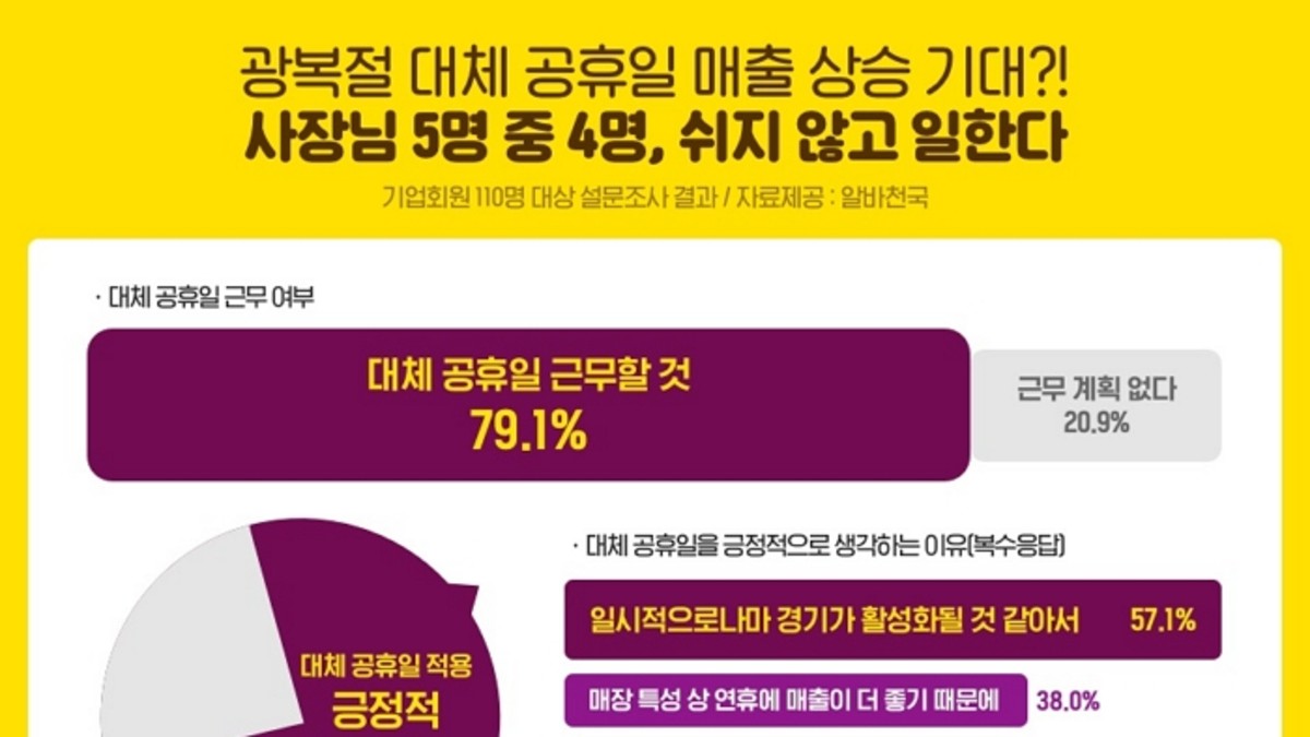 [인사이트] 전준강 기자 = 알바천국이 기업회원 110명을 대상으로 '광복절 대체공휴일' 관련 설문조사를 실시한 결과, 5명 중 4명(79.1%)이 대체 공휴일에 쉬지 않고 매장을 운영 또는 근무할 예정이라 답했다.
