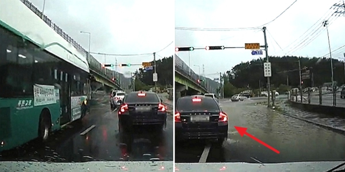 작성자는 "이 버스가 비상등을 켜고 정지 중인 이유가 갑작스러운 폭우로 인해 우회전 차로에 물웅덩이가 생겨 우회전 차량들을 위해 일부러 그런 것이었다"라며 버스기사에게 감사 인사를 전했다.