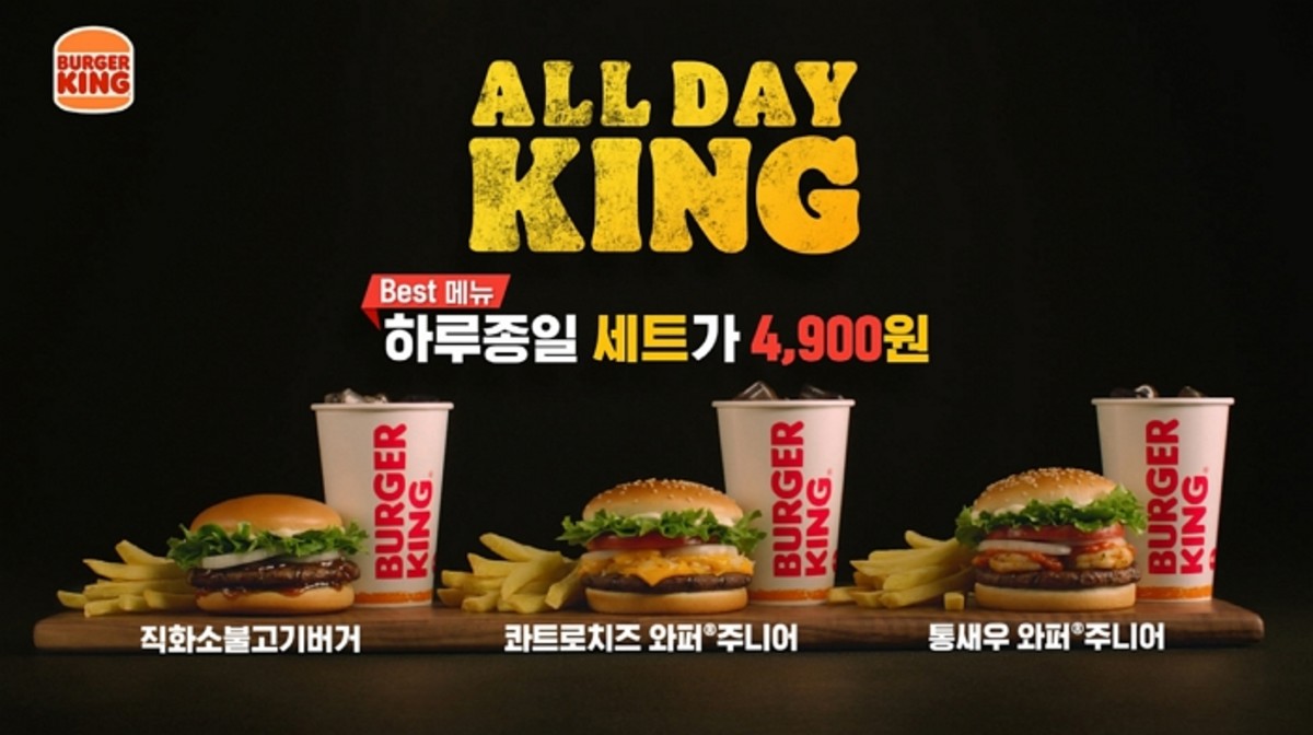 '올데이킹'은 버거킹의 차별화되는 비즈니스 전략을 보여주는 대표 메뉴로, 시간 제약 없이 하루 종일 버거킹의 인기 세트를 4,900원과 5,900원이라는 합리적인 가격대로 즐길 수 있는 것이 특징이다.