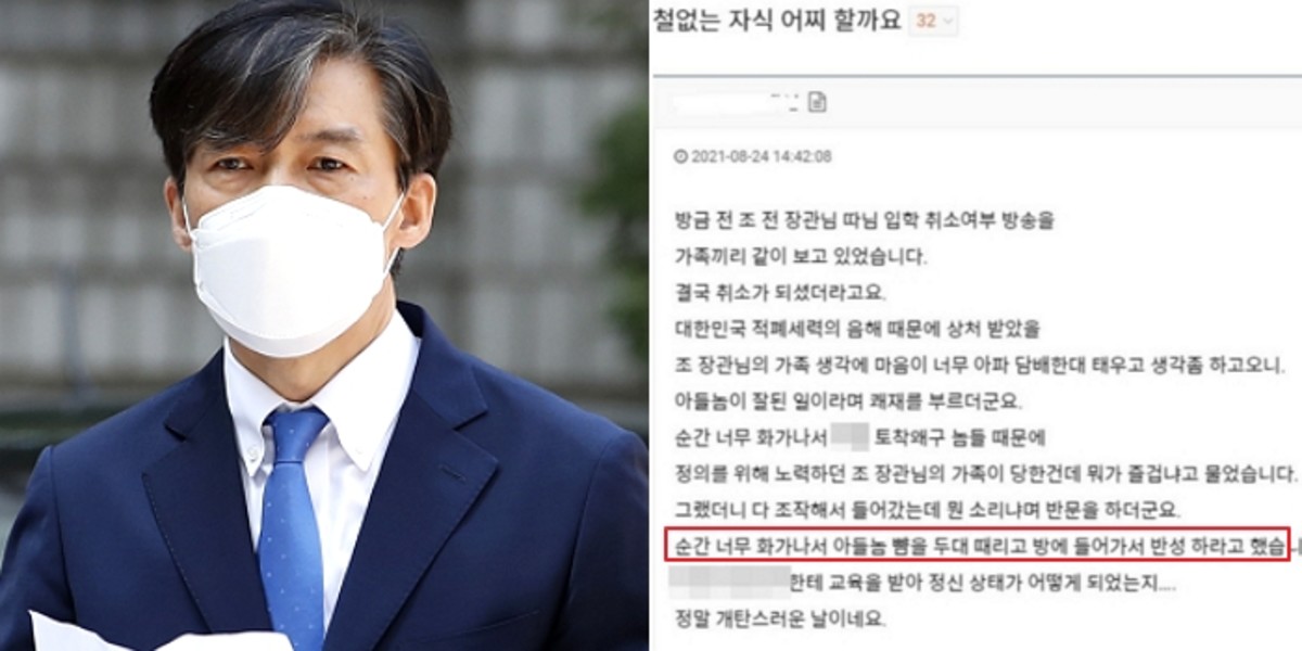 조 전 장관 지지자라는 작성자 A씨는 "대한민국 적폐 음력의 음해 때문에 상처 받았을 조 전 장관님 가족 생각에 마음이 아파 담배 한 대 태우고 생각 좀 하고오니, 아들 놈이 잘 된 일이라며 쾌재를 불렀다"고 했다.