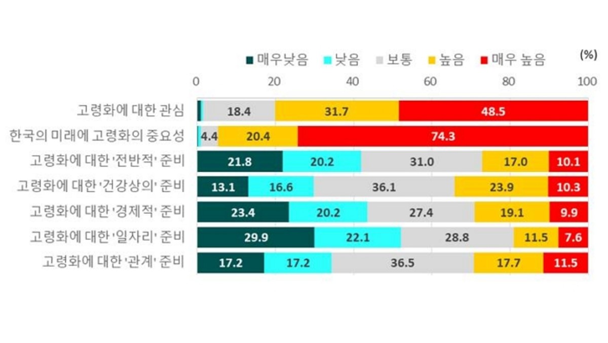 고령화에 대한 인식과 준비를 묻는 조사에서는 우리의 미래에 고령화가 중요하다고 인식은 매우 높으나, 고령화에 대한 준비는 현격한 수준으로 낮게 나타났다. 특히, 일자리를 비롯한 노후의 경제적 준비와 대응은 매우 부족하다고 평가하고 있다.