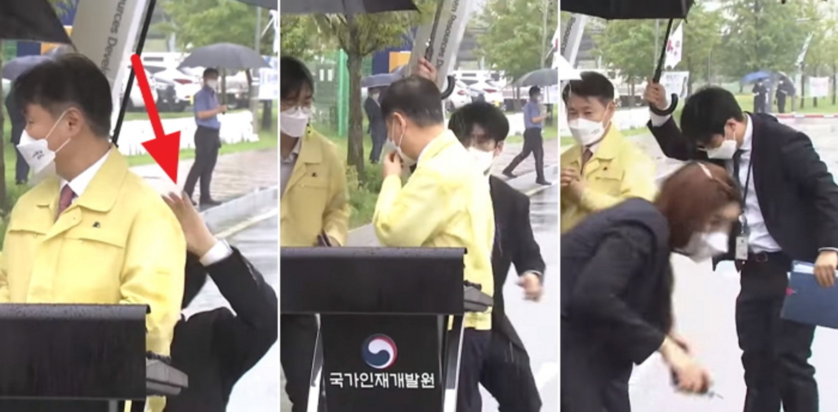 바지가 젖어가는 동안에도 10분 넘게 우산을 받쳐준 덕분에 강 차관은 비를 조금도 맞지 않고 브리핑을 할 수 있었던 것이다.