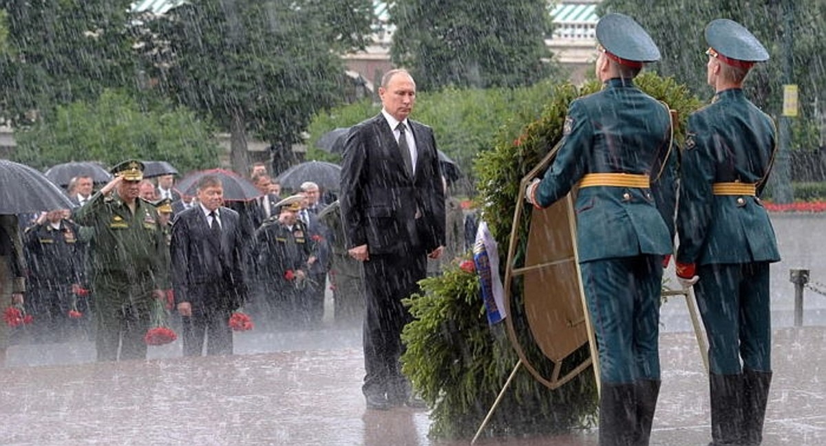 지난 2017년 6월 22일 푸틴 대통령은 '추모와 애도의 날'에 폭우를 맞으며 무명용사의 묘에 헌화했다.