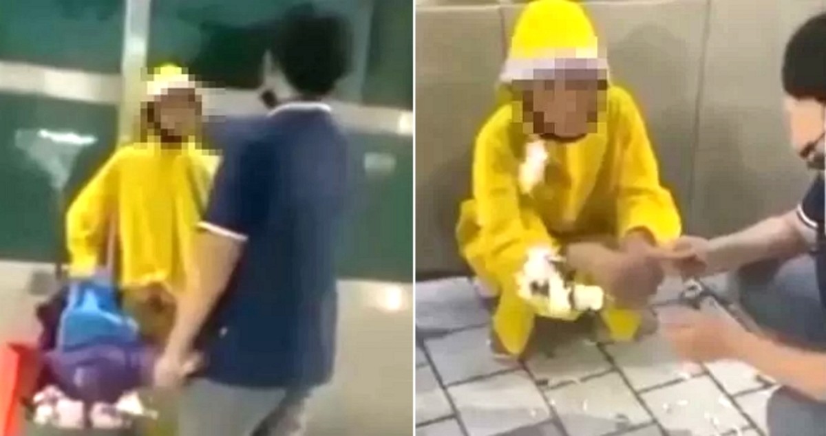 영상에는 노란 우비를 입은 60대 할머니와 교복을 입은 고등학생이 거리에 쪼그려 앉아있는 모습이 나온다.